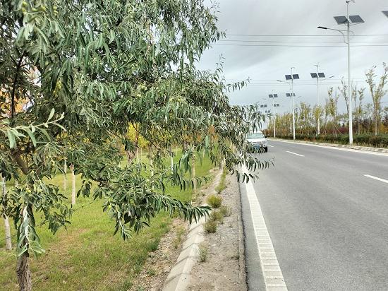 沙枣路。位于格尔木城市建成区东部,北至星园路,南至黄河东路,全长约1公里。原沙枣路道路分隔带现状无基本绿化植物,现场大多为野生植物;两侧绿化带以原生杨树和柽柳为主,植物生长杂乱无章,无景观效果。绿化带中土壤质量下降,难以维系植被种植需求,部分绿化分隔带中虽设有 U 型水渠,水渠断连,缺乏贯通的绿化灌溉系统; 2023年市林草局通过主要绿化改造提升、原有人行步道修缮、U型渠修缮及新建、沿绿化带边界增设护栏,整条道路以胡杨为主要行道树,杨树象征着的是中华民族的精神,在碰到各种困难的时候,希望我们保持一种杨树的精神,给大地奉献出一片绿色,在大漠中给人憧憬、给人希望;建设过程中对原有树木进行了移栽和杂草清除,两侧绿化带土地平整。对绿地种植土进行改良,重新进行绿化种植设计; 改造后的沙枣路视觉通畅,层次分明,错落有致的绿化带可以改变单调的道路景观,避免司机在行车过程中产生驾驶疲劳。同时优美的绿化景观可起到美化路容和市容的作用。也为来去匆匆的行人提供放慢脚步的清新绿廊。不仅改善城市的生态环境,还起到美化城市的作用。这也是格尔木市道路绿化从过去“统一高度”向“层次分明”,“纯绿色”向“多彩”,打造一路一景、四季各有特色的城市道路景观的代表点。