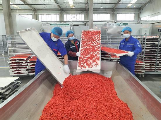 格尔木农垦集团枸杞生产线上,工人们正在收集采用锁鲜工艺烘干的枸杞(马祥苍 摄)